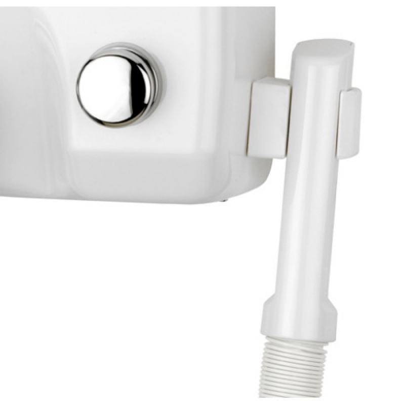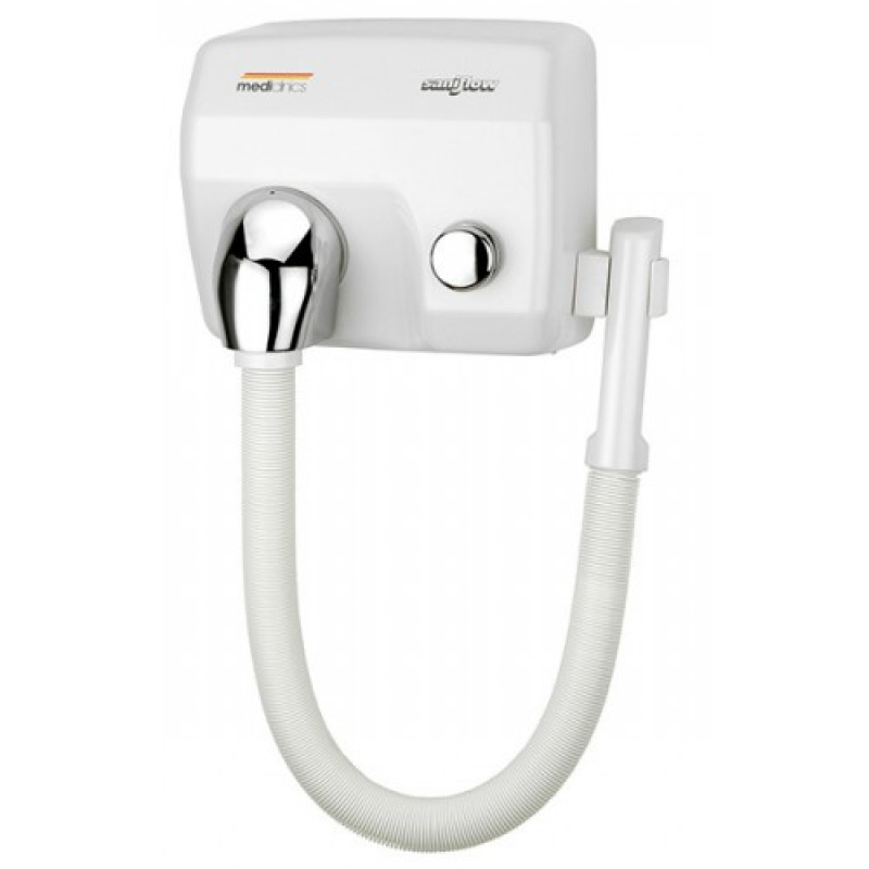 Мощный двигатель обеспечивает высокую производительность и быстрый поток воздуха со скоростью до 97 км/ч. Длина шланга составляет 1000–2500 мм, в нерабочем состоянии он удобно размещается на рычаге справа. Сушилка включается нажатием кнопки, а автоматическое отключение происходит через 90 секунд, что повышает энергоэффективность.