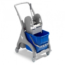 Тележка укомплектована ведром объемом 25 литров с синей ручкой, отжимом TEC, а также имеет четыре пластиковых колеса диаметром Ø80 мм с бамперами, предотвращающими повреждения мебели и стен. На задней части ведра предусмотрено место для хранения бутылок и флаконов с моющими средствами. Для сбора мусора тележка может быть доукомплектована держателем для мешка на 50 литров (арт. S070100), который приобретается отдельно.