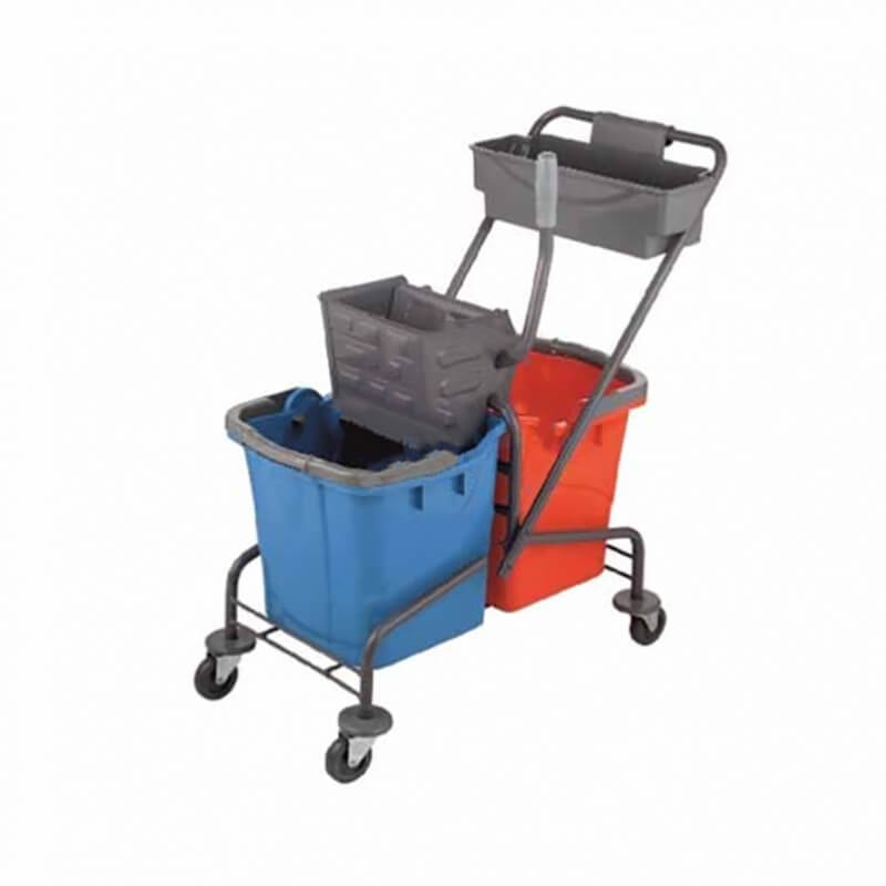 Тележка укомплектована двумя вместительными ведрами объемом по 25 литров, корзинкой для хранения необходимых аксессуаров и системой отжима, что делает процесс уборки более удобным и эффективным.