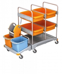 Тележка для горничных TSZ-0008 от польского производителя SPLAST — это профессиональная модель, которая подходит для уборки в гостиницах, отелях, санаториях и хостелах. Тележка оснащена двумя ведрами по 6 литров, двумя ведрами по 20 литров, прессом для отжима, двумя вместительными мешками для мусора объёмом 120 литров каждый и четырьмя глубокими выдвижными кюветами для хранения инвентаря и принадлежностей.