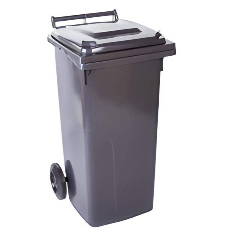 Мусорный бак объемом 120 литров в сером цвете сочетает в себе практичность, долговечность и современный дизайн, что делает его удобным для повседневного использования.