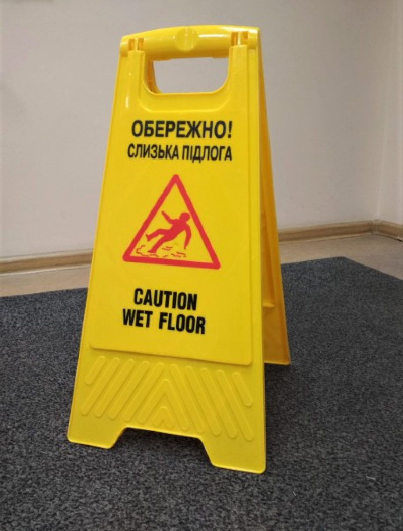 Табличка предназначена для предотвращения несчастных случаев в местах, где проводится влажная уборка. Двухсторонний дизайн и яркий жёлтый цвет делают её заметной и легко различимой. Надписи выполнены на украинском и английском языках, что позволяет использовать табличку в местах с интернациональными посетителями.Ключевые преимущества: