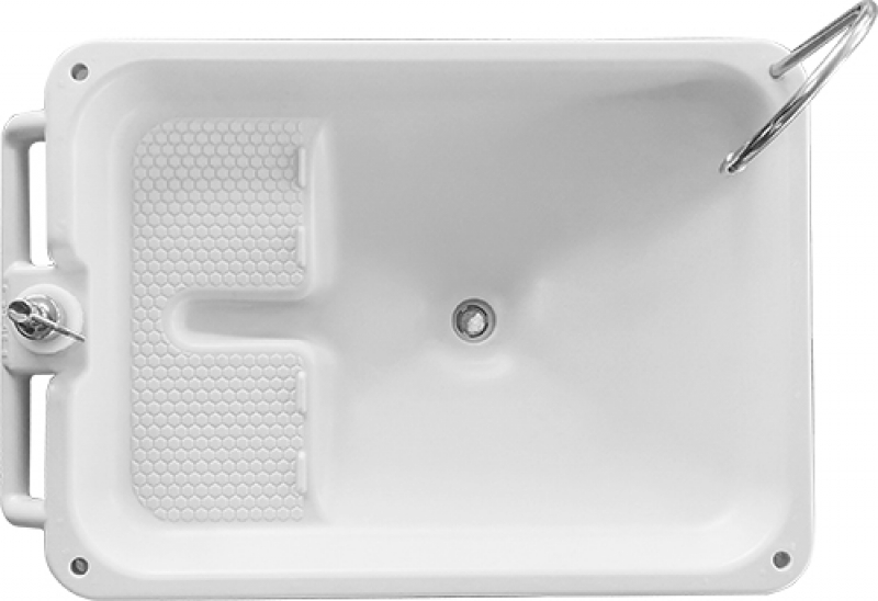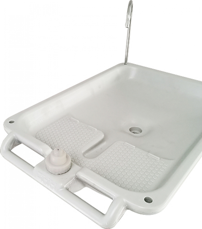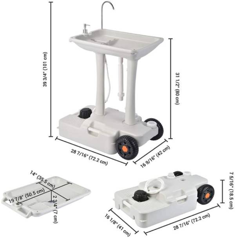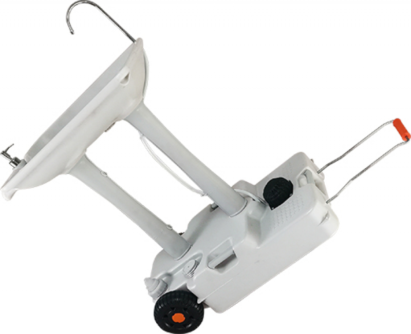 - Мобильность: оснащен двумя пластиковыми колёсами и выдвижной металлической ручкой, что позволяет легко транспортировать умывальник.