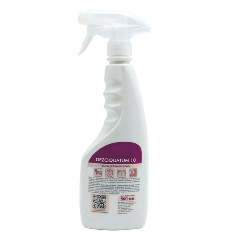 Дезинфицирующее средство DEZOQUATUM 10, 500 мл (DQ010500T) — эффективный дезинфицирующий раствор для обработки небольших поверхностей и быстрой дезинфекции. Средство готово к использованию, обладает широким спектром действия, уничтожает бактерии, вирусы и грибки, включая вирусы COVID-19 (SARS-CoV-2). Оснащено распылителем для удобного применения.