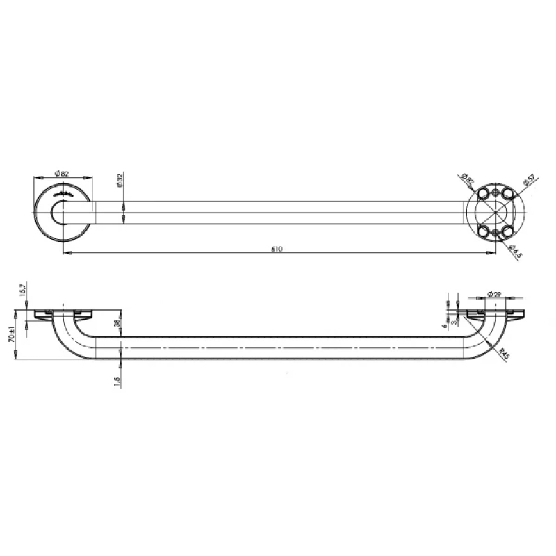 - Габаритні розміри: 692 х 82 х 70 мм, Ø трубки 32 мм, товщина стінки 1,5 мм.