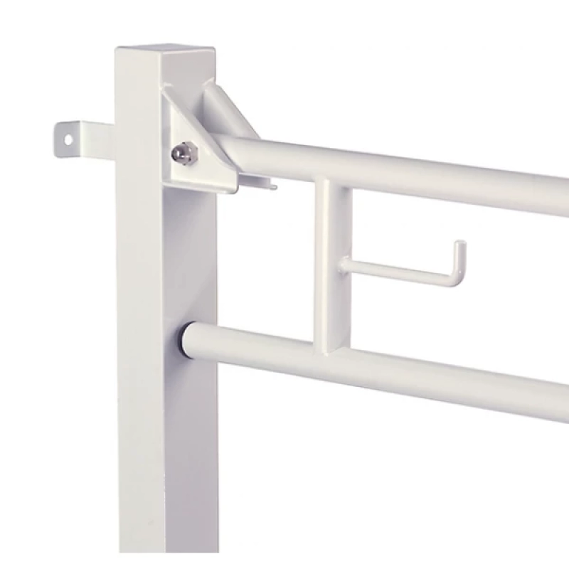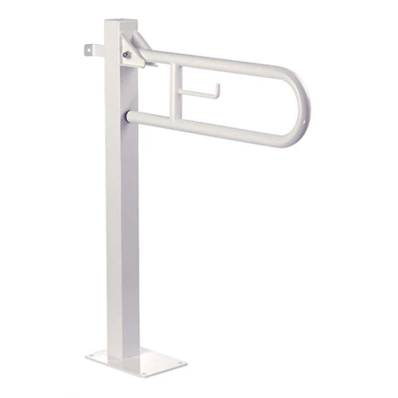 Відкидний механізм дозволяє перевести поручень з вертикального положення в горизонтальне. Проста система блокування надійно фіксує поручень у вибраному положенні. Додаткову зручність забезпечує вбудований тримач для туалетного паперу.