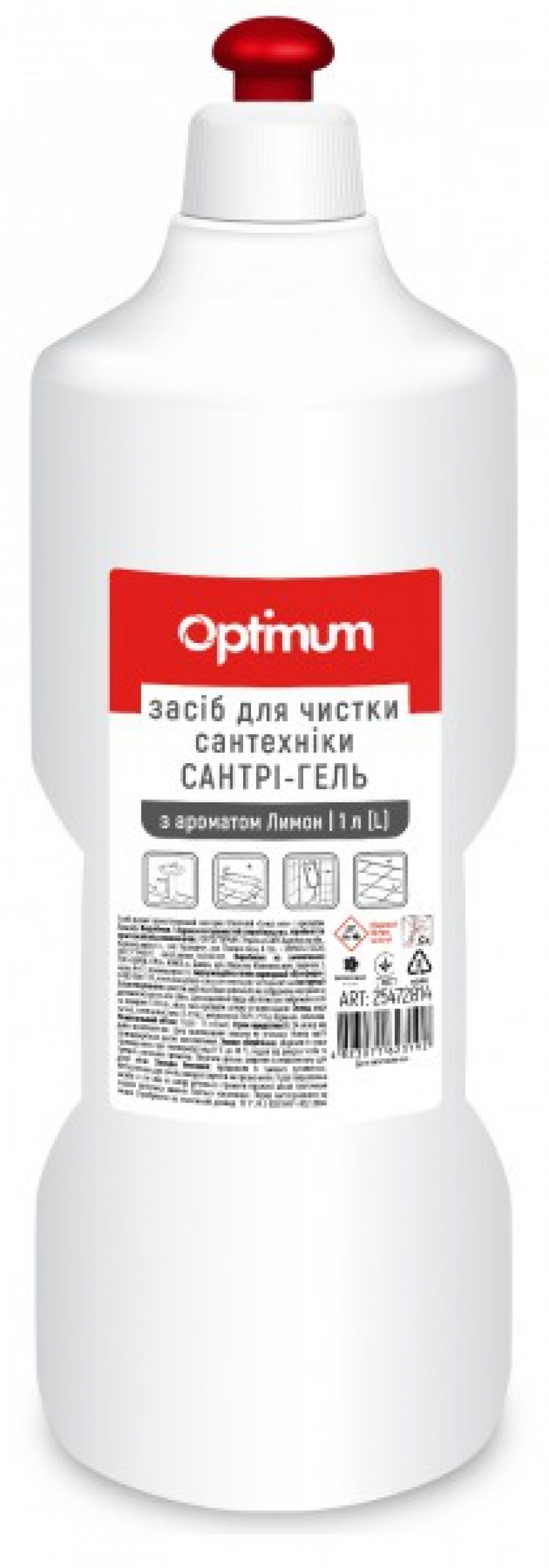 OPTIMUM Засіб для миття та дезінфекції сантехніки "Сантри-гель" Лимон, 1 л (артикул 25472810) – це сильнокислотний засіб, розроблений для ефективного чищення та дезінфекції сантехніки. Продукт на основі соляної кислоти ефективно видаляє вапняний наліт, іржу, підтікання, мильні розводи та сольові відкладення.