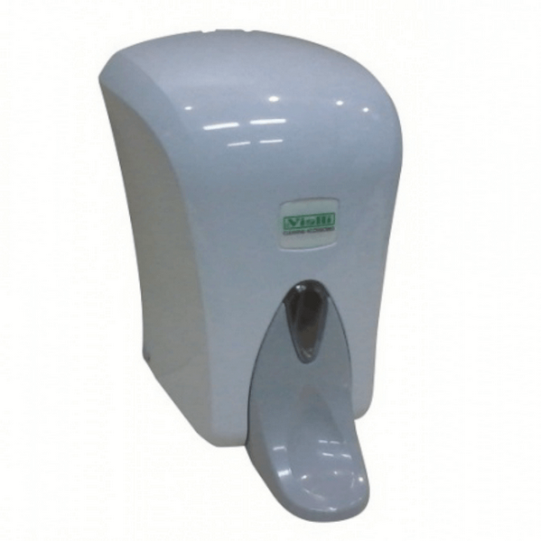 Корпус дозатора виготовлений із міцного білого пластику, який легко очищується та є стійким до зносу. Об’єм резервуара становить 1 літр, що дозволяє використовувати пристрій у приміщеннях із великою прохідністю. Замок забезпечує захист вмісту, а кріплення на шурупах гарантує надійну фіксацію на стіні.