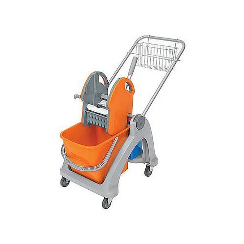 Візок укомплектований двома відрами — помаранчевим об’ємом 25 літрів і синім об’ємом 6 літрів, що дозволяє розділяти чисту й брудну воду. Наявність кошика для інвентарю робить візок ще більш функціональним, а вбудований віджим полегшує роботу з мопами. Оснащення чотирма колесами діаметром 75 мм забезпечує легке переміщення, захищаючи поверхню від пошкоджень.