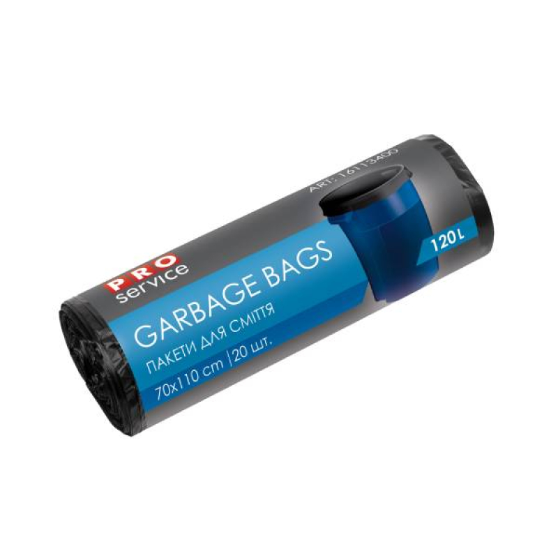 Пакети для сміття PRO service Standard, чорні, 120 л (арт. 16113400) – це чудове рішення для збору великогабаритного легкого сміття, такого як картон, пінопласт та інші матеріали. Ці пакети поєднують легкість і міцність, що робить їх для використання у місцях з великим об’ємом відходів, таких як кінотеатри, торговельні центри чи склади.