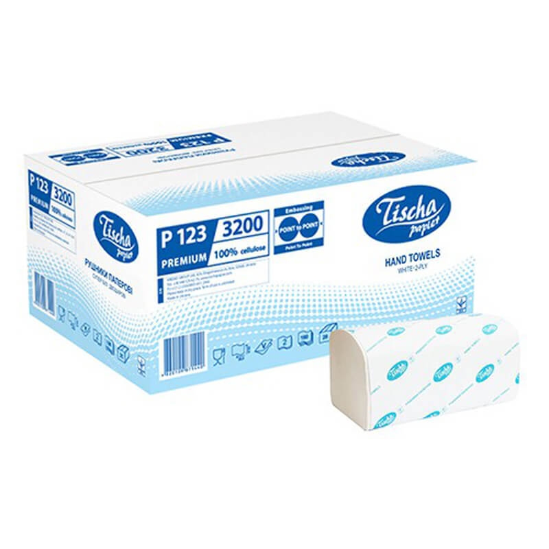 Паперові рушники PREMIUM P123 із 100% білої целюлози поєднують м’якість, міцність і чудові вбиральні властивості. Завдяки технології point-to-point із клеєм ці рушники мають унікальну текстуру: верхній шар покритий багаторівневим тисненням, а нижній — мікротисненням. Двошарова структура склеєна для покращення вологостійкості та міцності.