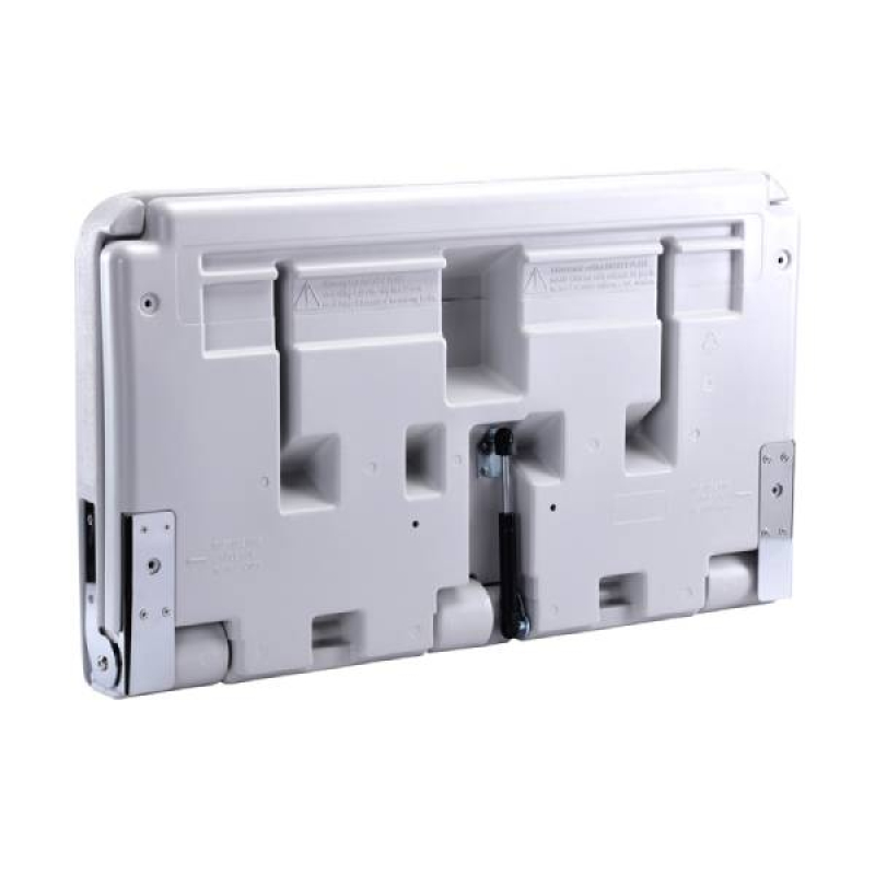 Конструкція оснащена вбудованим сталевим каркасом, посиленими сталевими шарнірами по всій довжині та монтажним кронштейном, що запобігає зносу матеріалів та гарантує довговічність виробу. Пневматичний механізм забезпечує плавне та безшумне відкривання і закривання, що підвищує зручність використання. Вбудовані ємності для одноразових пелюшок та два гачки для сумок створюють додаткові зручності для батьків, а захисний ремінь із замками-засувками дозволяє надійно зафіксувати дитину. Антибактеріальна поверхня запобігає розмноженню бактерій і сприяє збереженню гігієнічності.