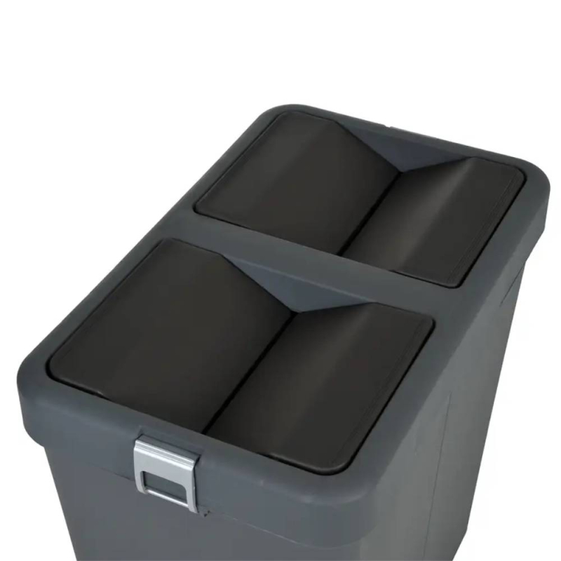 Подвійна конструкція дозволяє зручно розділяти відходи. Відро оснащене знімною кришкою, яка закріплюється за допомогою бокових застібок і надійно утримує сміттєвий пакет. Поворотна кришка, що обертається на 180°, запобігає поширенню запахів і забезпечує гігієнічність.