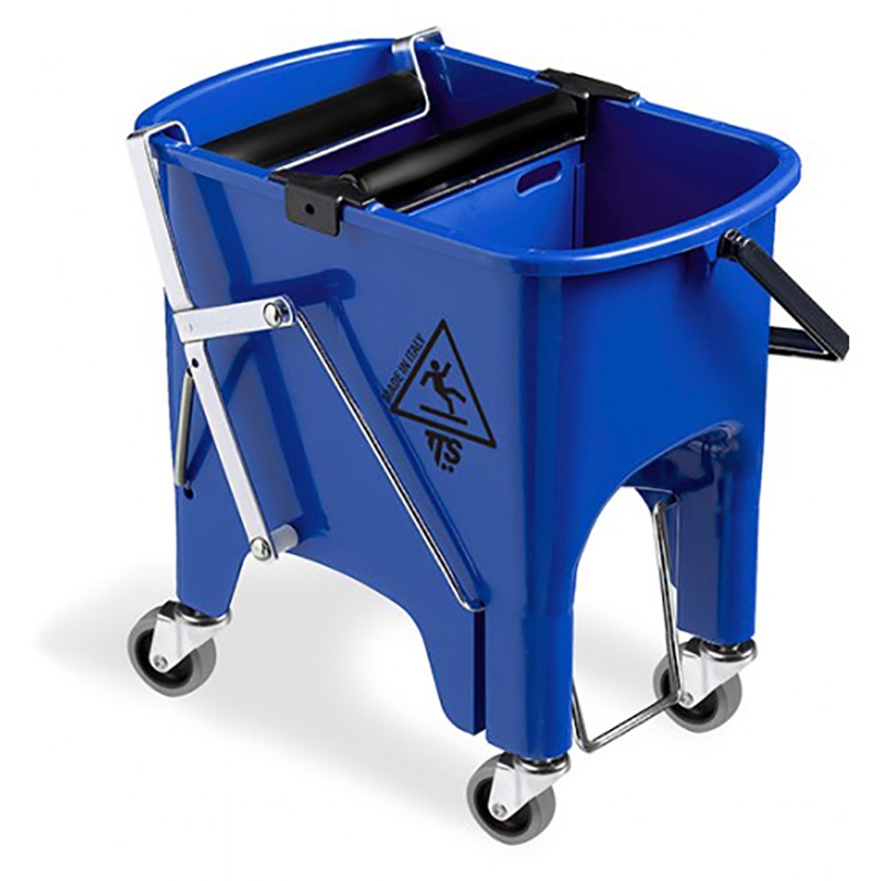 Подвійне відро виготовлене з міцного поліпропілену синього кольору, стійкого до пошкоджень і впливу хімічних речовин. Воно оснащене 4 колесами діаметром 50 мм, які забезпечують легке переміщення навіть при повному завантаженні. Відро включає роликовий віджим, педаль для зручного використання та ергономічну поліпропіленову ручку для перенесення.Характеристики: