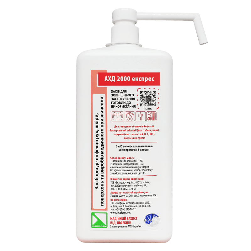 АХД-2000 – дезінфікуючий засіб об’ємом 1 літр, призначений для гігієнічної та хірургічної обробки рук і шкіри, а також для швидкої дезінфекції невеликих поверхонь і некритичних медичних виробів. Це готовий до використання розчин, що забезпечує високий рівень захисту та догляду за шкірою.